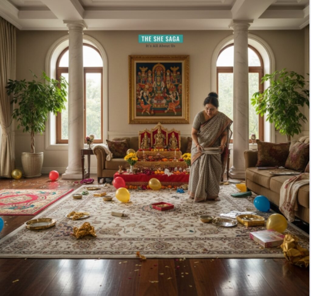 The night of revelry in the name of celebration was over, while the telltale signs were all over… the room. The humongous efforts she had made, from helping with preparing lip smacking choley, aromatic pulao, melt-in-the-mouth-dahivada, creamy kheer for an entire army; to the intricate rangoli, decorating the Puja altar, to lining up the diyas, just so that her Madam would not be hassled, seemed to have been successfully achieved,if the chaos was could be considered any measure.