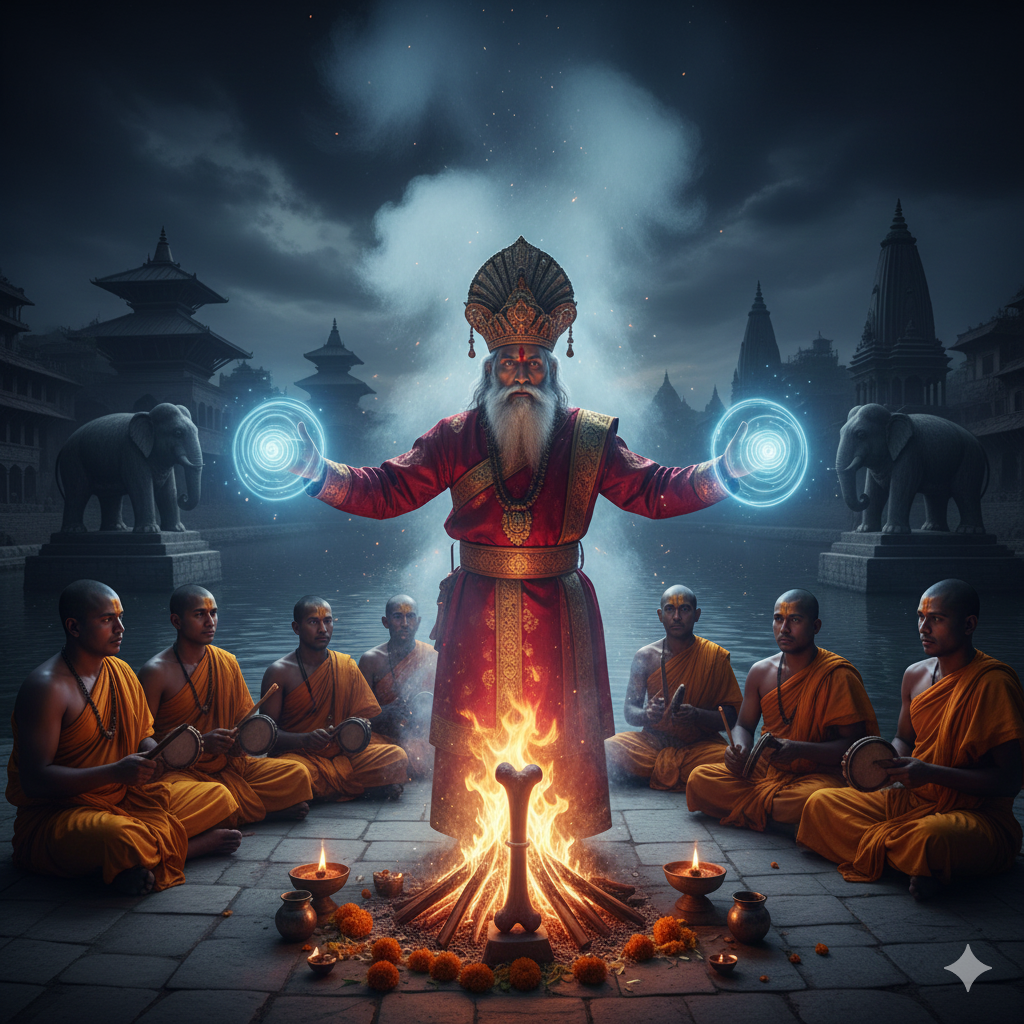 Later that day, in consultation with the court priest, a trap was set. As the woman bathed, the king stealthily tied a string to the hem of her garment. Following this trap, the royal entourage was led to a grave discovery. A human shinbone resting on the pond floor! All doubt vanished. This was no common beast, but the Kichkandi!