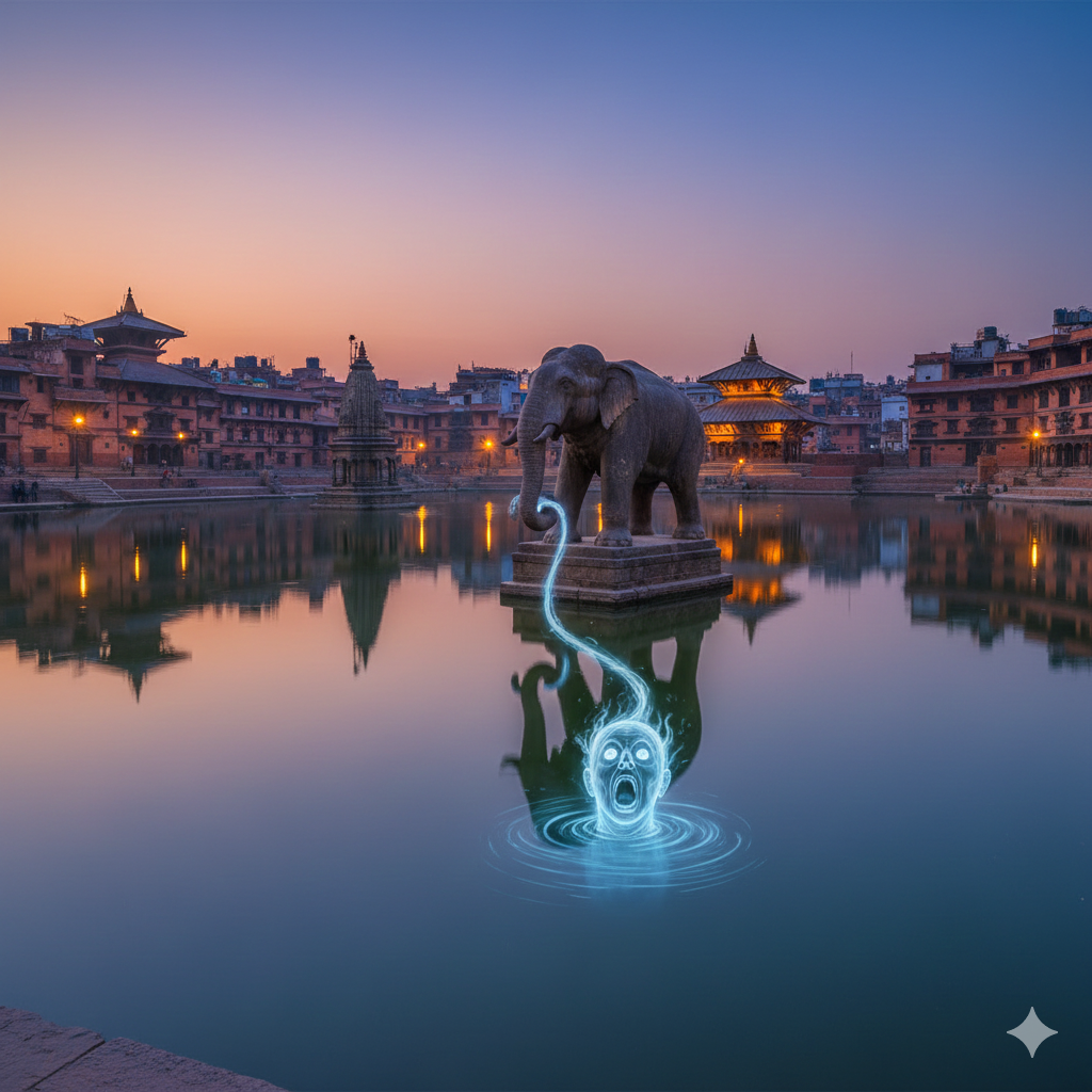 The priest stood upon the banks and performed an ancient rite. He used his powers to breathe life into the stone statue of the elephant that stood at the pond’s edge. “Grasp the pishacha!” he commanded. The structure moved, its trunk capturing the demonic sprit and locking it into a tight embrace for all the years to come. This is how Ranipokhari was finally freed of the evil. That mighty elephant, forever gripping the trapped spirit, still stands vigil on the bank – a witness to the horror that clouded the serene waters of the pond.