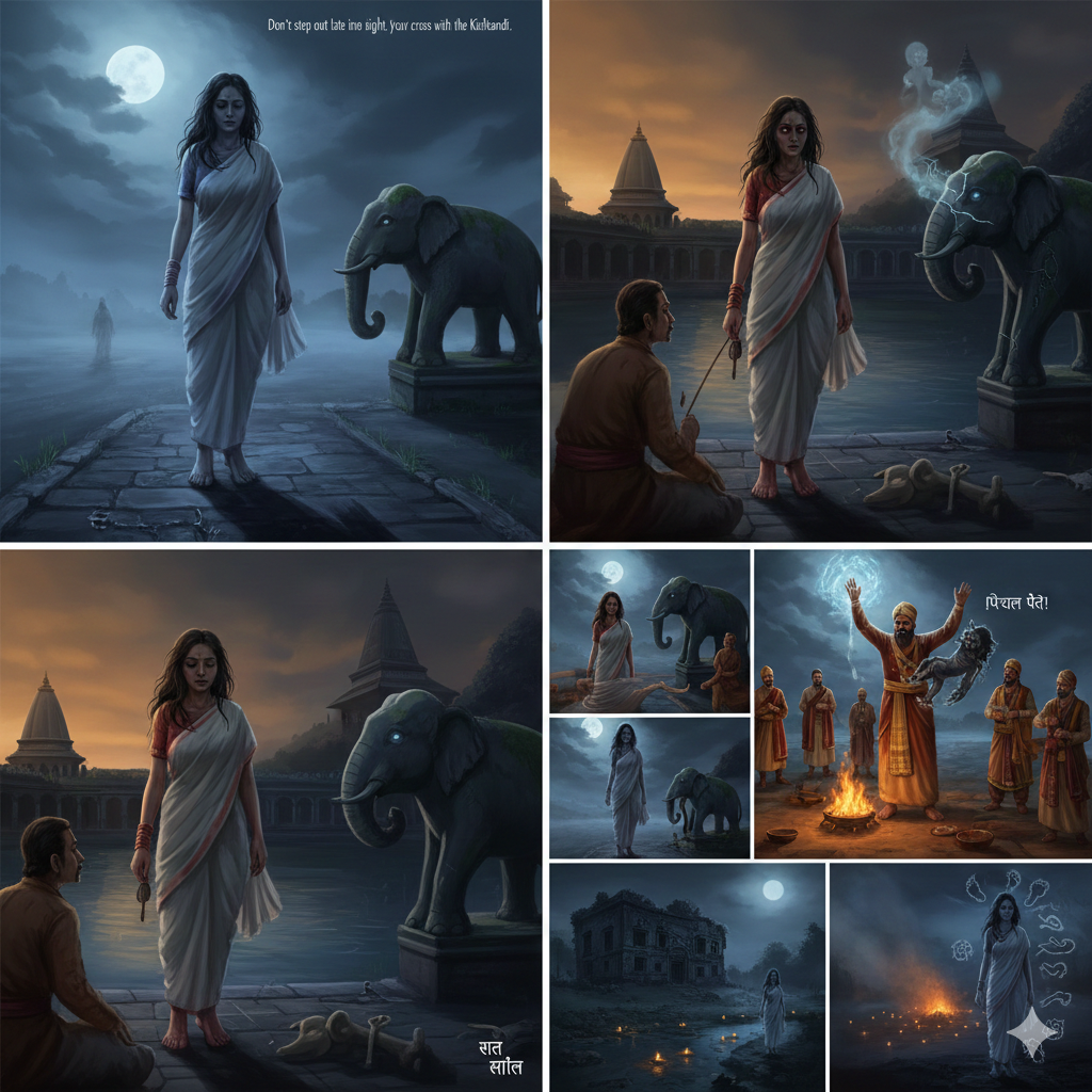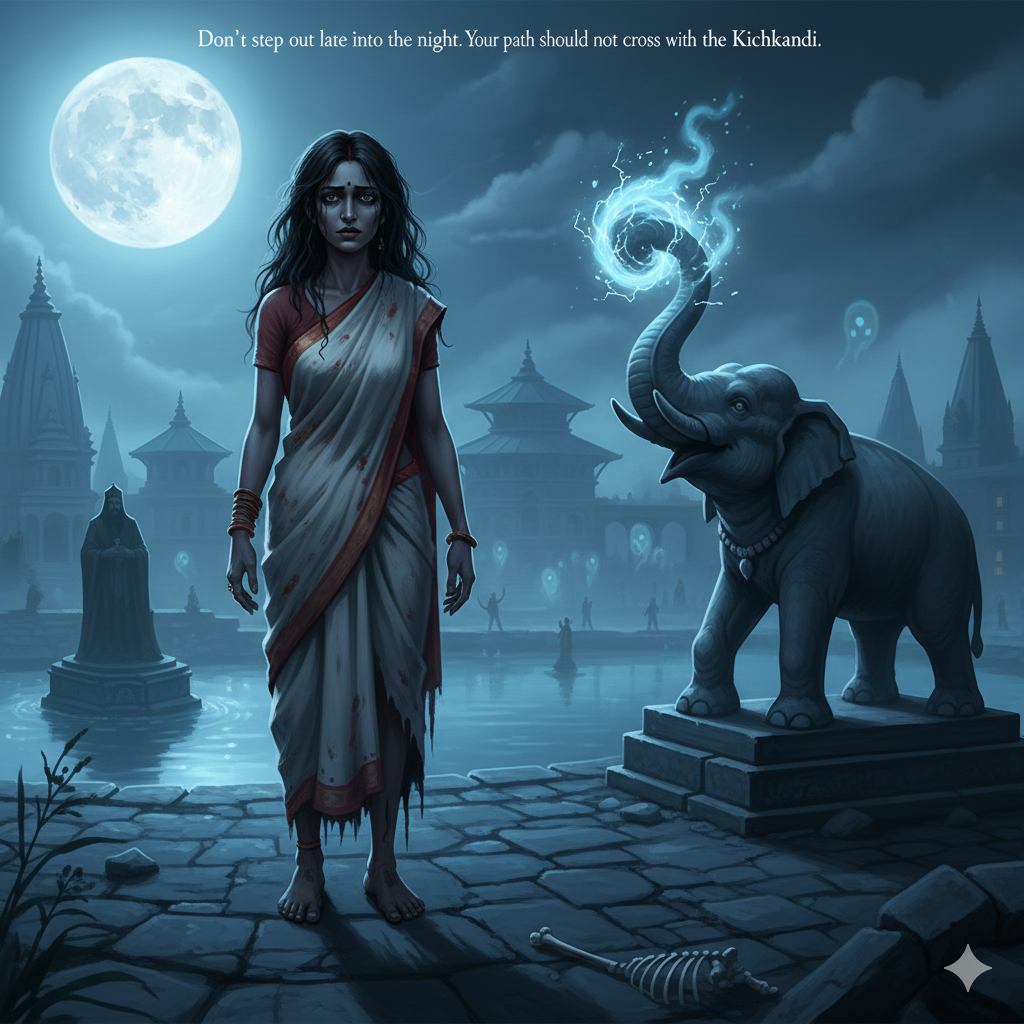 The Kichkandi is a female entity, a pishacha or a vengeful ghost. Typically draped in a white sari the defining feature is her cursed anatomy – her feet that face backward.