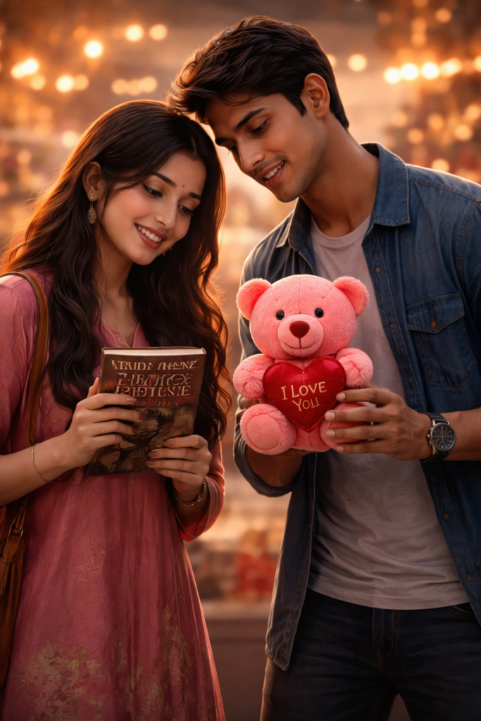 The day went well. They laughed, browsed, and debated. Finally, they picked a copy of Pride and Prejudice by Jane Austen, a delicate silver heart-shaped pendant, and a bottle of soft, elegant perfume. Nisha chose each gift carefully, confident that any girl would love them. Rahul thanked her repeatedly, almost too earnestly.